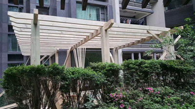 5、最后,成都花架公司小編建議,做好防腐木花架后,還要給防腐木花架周?chē)M(jìn)行水泥灌注,固定防腐木花架,然后給表面上一層漆,保護(hù)其表面,從而使防腐木花架能夠很好地使用。